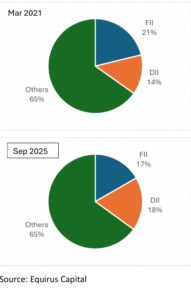 Equirus data shows that DII ownership rose from 14% in March 2021 to 18% in September 2025, while FII ownership declined from 21% to 17% over the same period. This trend underscores the resilience of domestic capital and its growing role in supporting India’s equity markets.